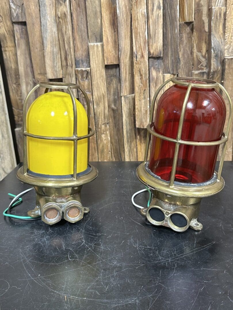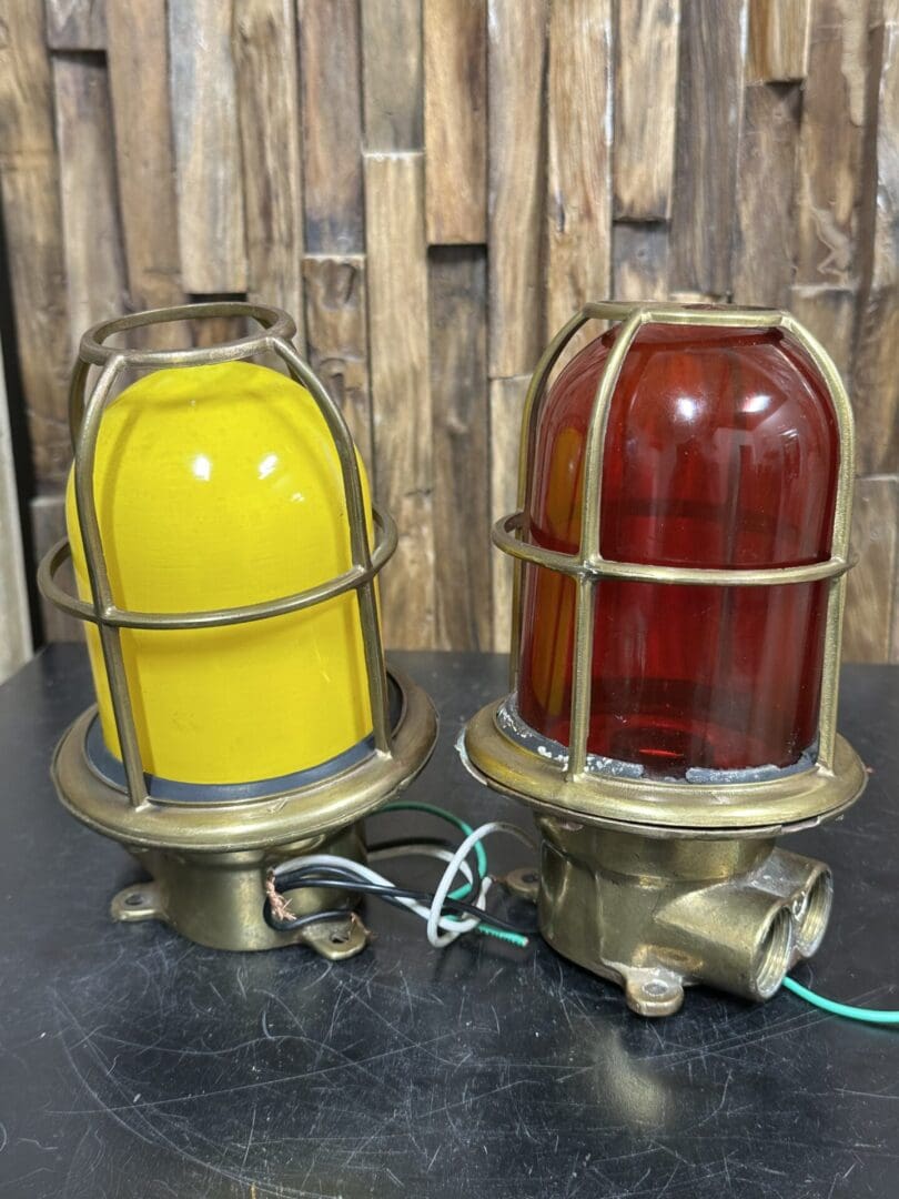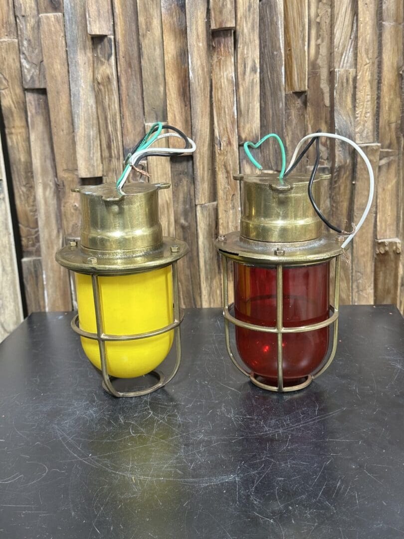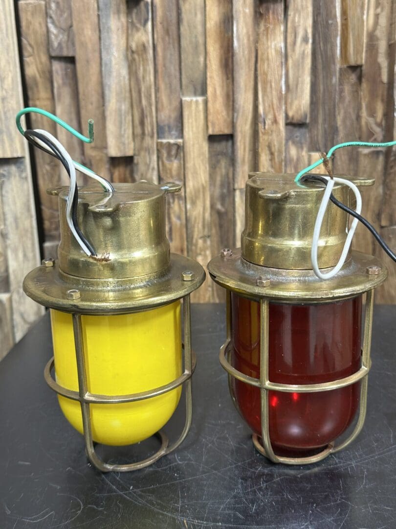 As found yellow & red ceiling lights, complete, wired with new lamp bases with attached wet ground wire.