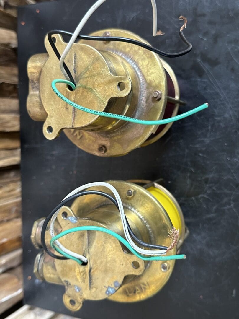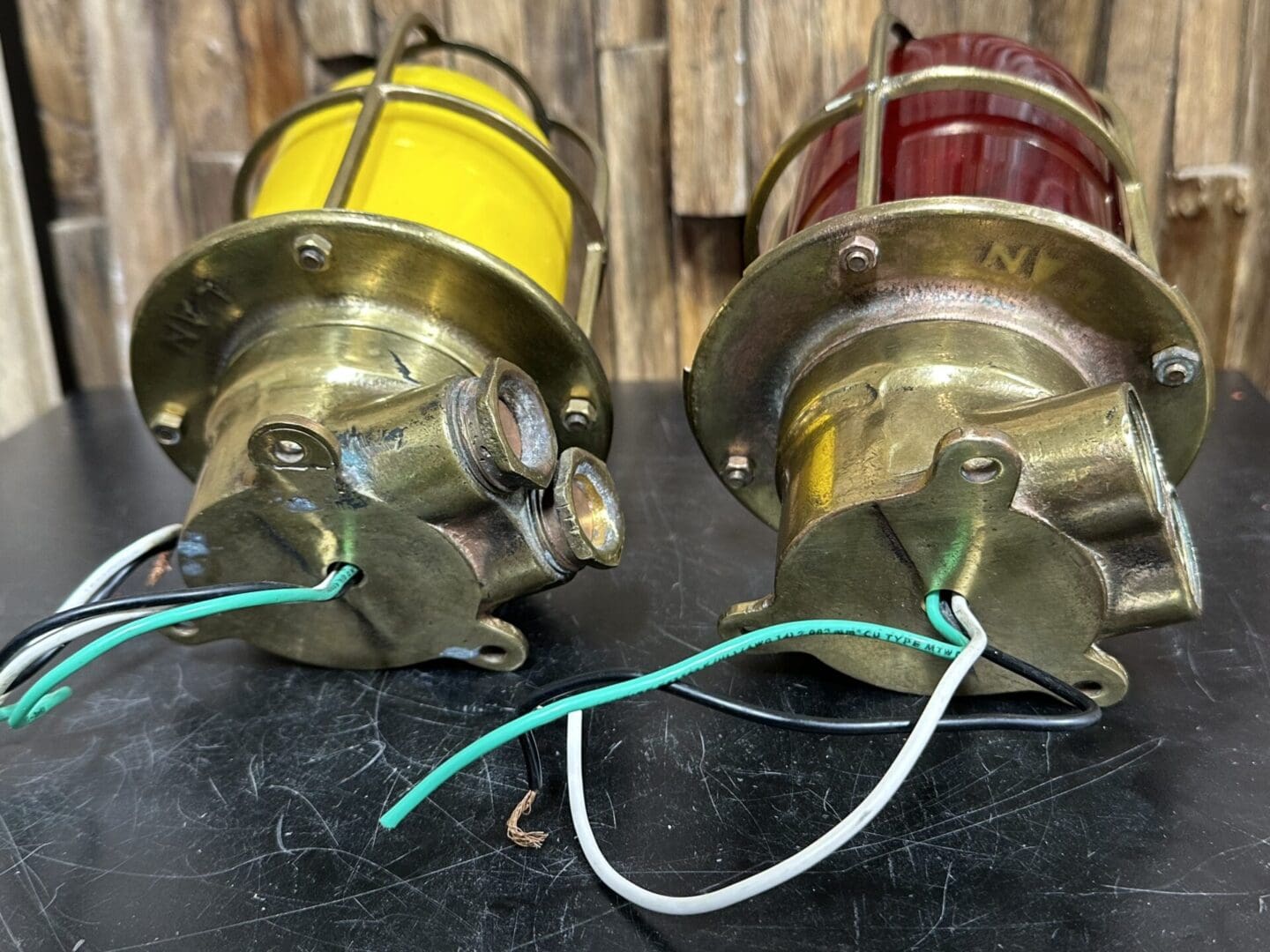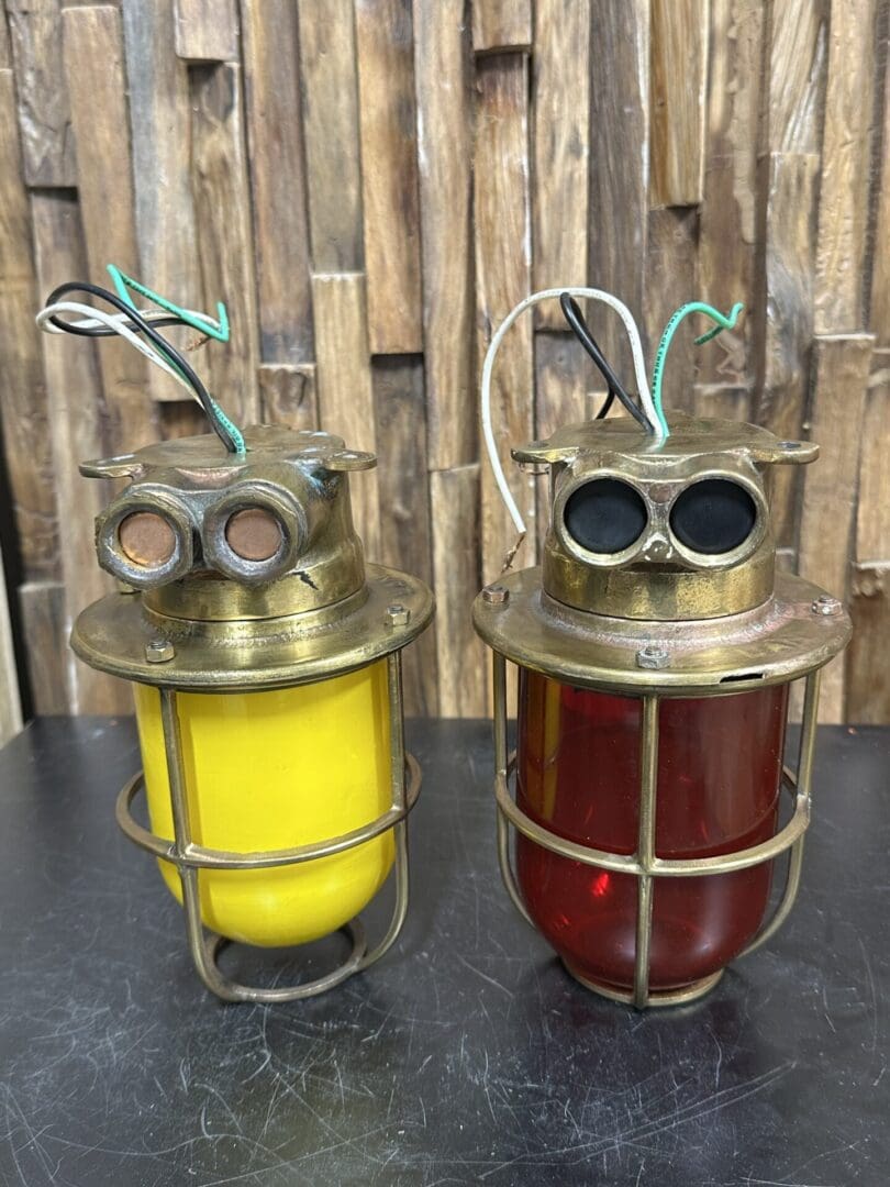 As found yellow & red ceiling lights, complete, wired with new lamp bases with attached wet ground wire.