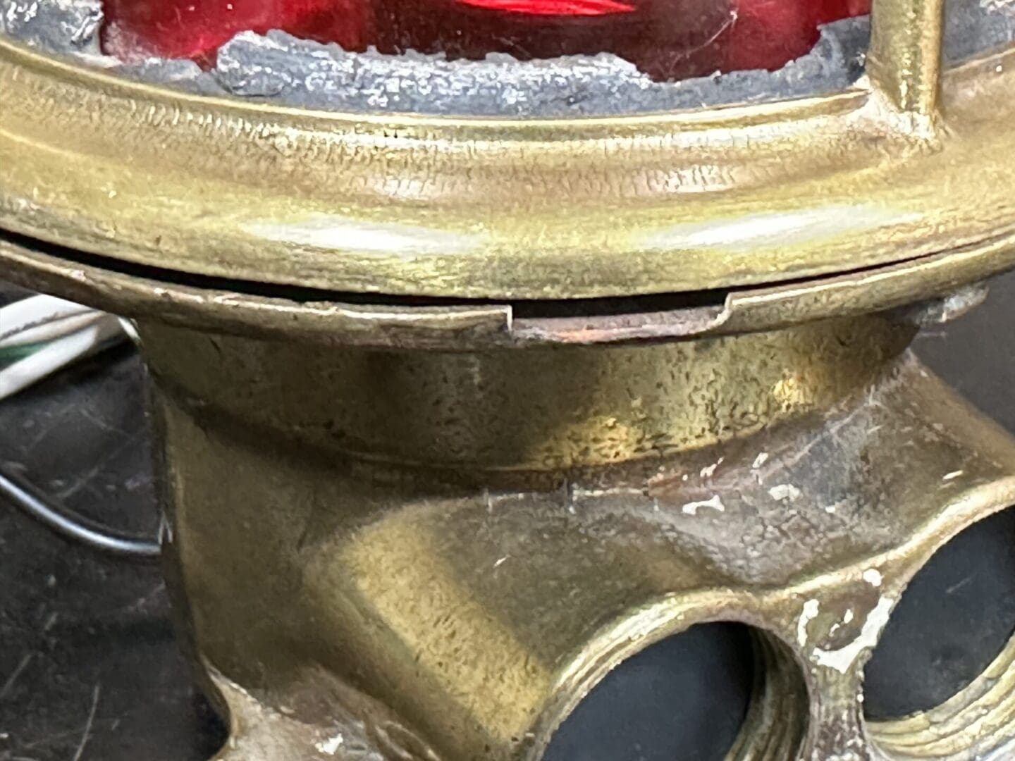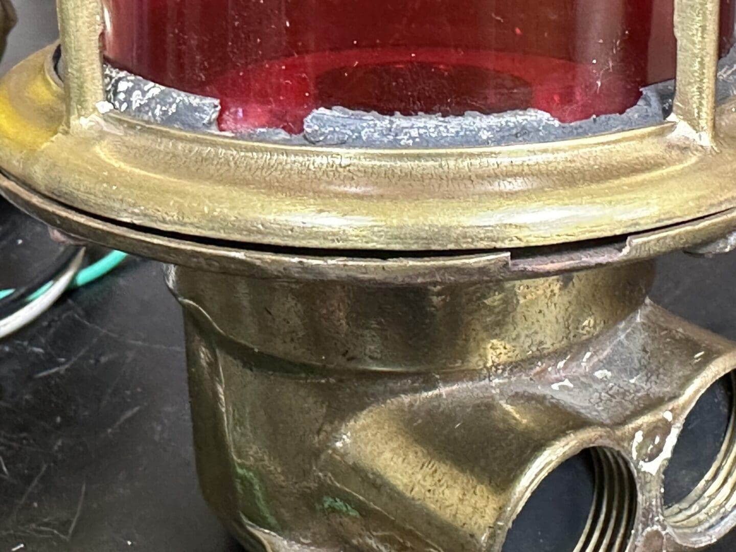The red light has a couple places where the thin metal lip on the base has cracked with age and broken off (see pics) this has zero to do with the weather proof of the light, there is a large rubber gasket between the lamp base and the glass globe.